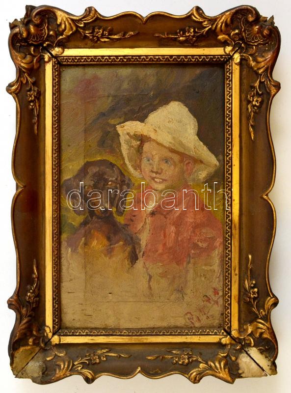 Leírás: Olvashatatlan jelzéssel: Kisfiú kutyával, olaj, vászon, díszes fa keretben, 25,5×16,5 cm