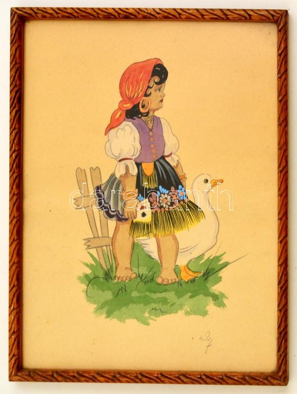 Leírás: Olvashatatlan jelzéssel: Kislány a libával. Akvarell, papír, üvegezett keretben, 33×26 cm