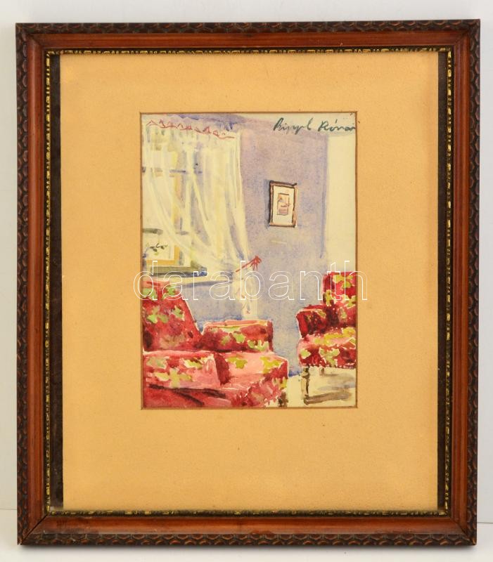 Leírás: Rippl jelzéssel: Enteriőr. Akvarell, papír, üvegezett keretben, 24×17 cm
