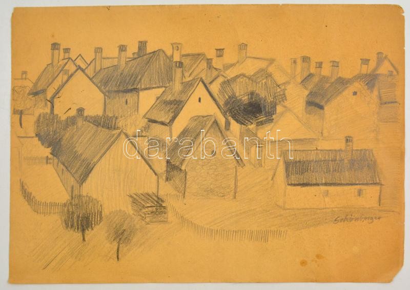 Leírás: Schönberger jelzéssel: Háztetők. Ceruza, papír, 29×42 cm