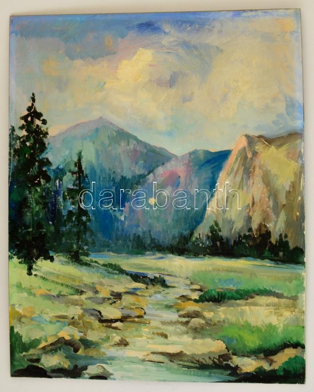 Leírás: Sipos János (?-): Ótátrafüredi völgy. Olaj, farost, jelzett, 50×40 cm