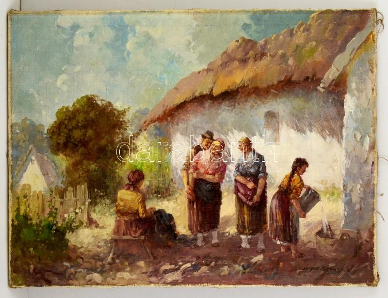 Leírás: Szegedi Kovács Ágoston (1888-1978): Udvarlás az udvaron. Olaj, vászon, jelzett, 60×80 cm