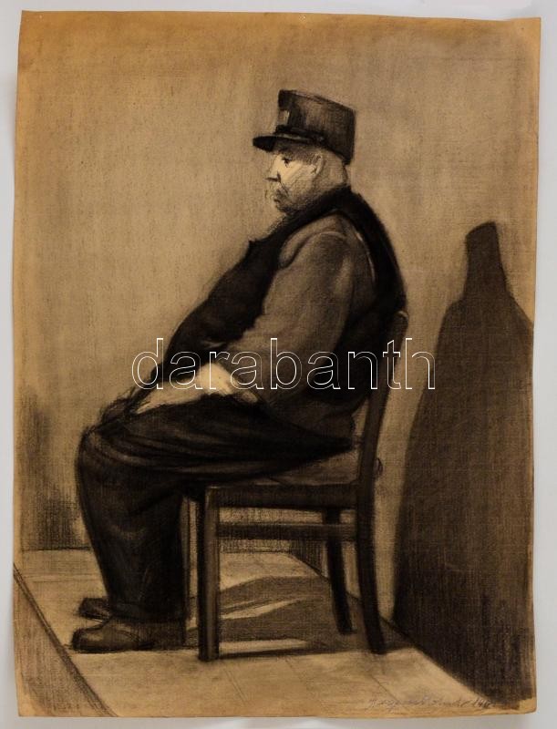 Leírás: Szegedi Molnár Géza (1906-1970): Vasutas. Szén, papír, jelzett, kis szakadással, 60x44 cm