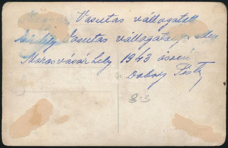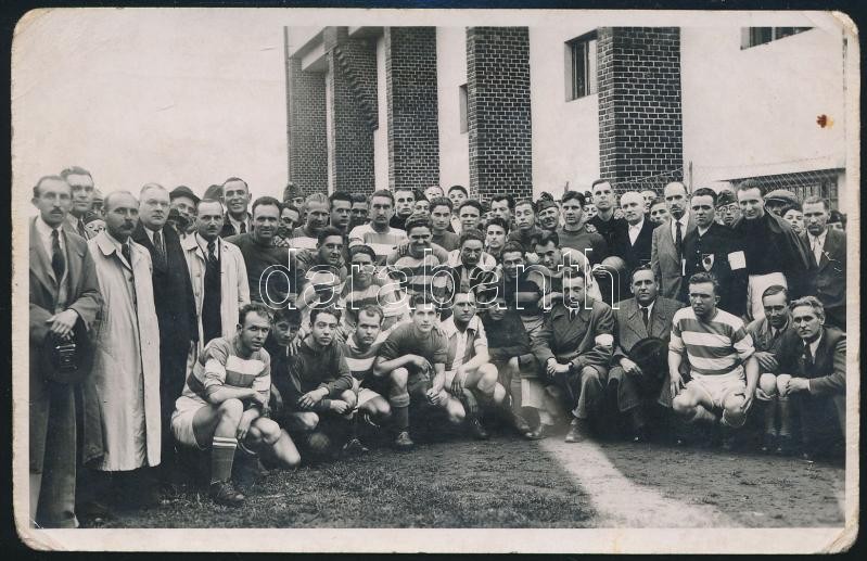 Leírás: 1943 Marosvásárhely, Magyar Vasutas Válogatott és Erdély Vasutas Válogatott közös csoportképe, hátoldalon feliratozott fotólap, 8,5x13,5 cm