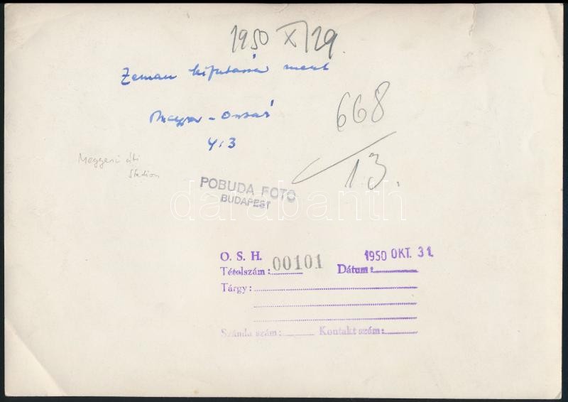 Leírás: 1950 Magyar-osztrák mérkőzés a Megyeri úti stadionban, fotó, hátulján feliratozva, pecséttel jelzett (Pobuda Foto), 16×22,5 cm