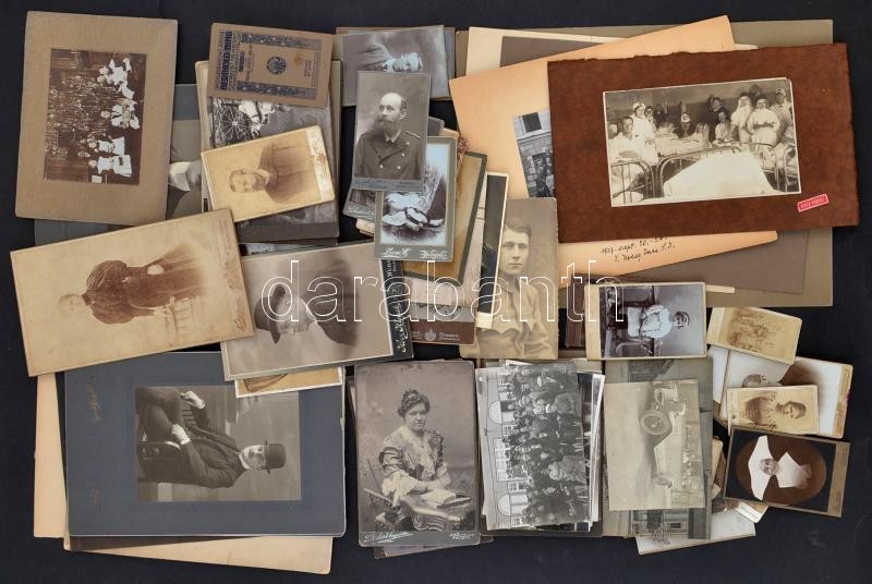 cca 1870-1910 63 db javarészt nevesített keményhátú fotóból álló fényképgyűjtemény. Nagyrészt vizitkártya és kabinetfotóméretű képekkel, néhány tablóval, vegyes témákban. Jó állapotban.