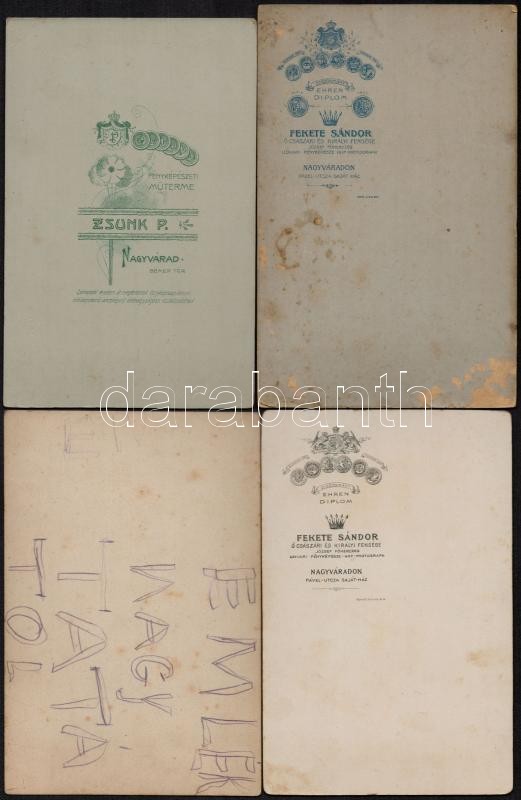 Leírás: cca 1880 Nagyváradi portrék, 5 db keményhátú fotó nagyváradi műtermekből (Lojanek János, Fekete Sándor, Zsunk Pál, Picek Róbert), különböző méretben