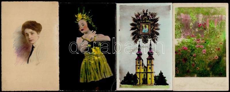 Leírás: cca 1914 és 1954 között készült, kézzel színezett 4 db vintage fénykép, fotólap méretben, három feliratozott, 14x9 cm
