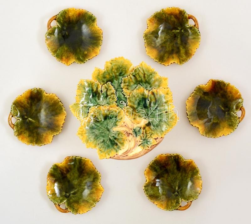 Leírás: Schütz Cilli 6 db leveles tálka, mázas kerámia jelzett, egyiken kis lepattanással, 16×16 cm (6×), + talpas kínáló, jelzés nélkül, m:13 cm, 26×27 cm