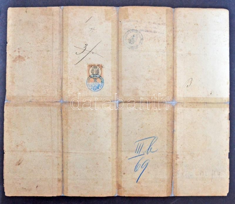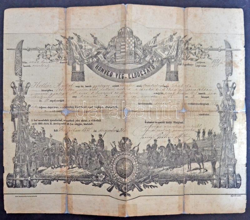 1881 Díszes katonai végelbocsájtó levél, gyalogos részére, észak-bácskai 4. honvédzászlóalj, a zászlóalj parancsnokának aláírásával, Szabadka, 15 kr. okmánybélyeggel, Arad sz. kir. város kapitányi hivatalának pecséjtével, javított, ragasztott.