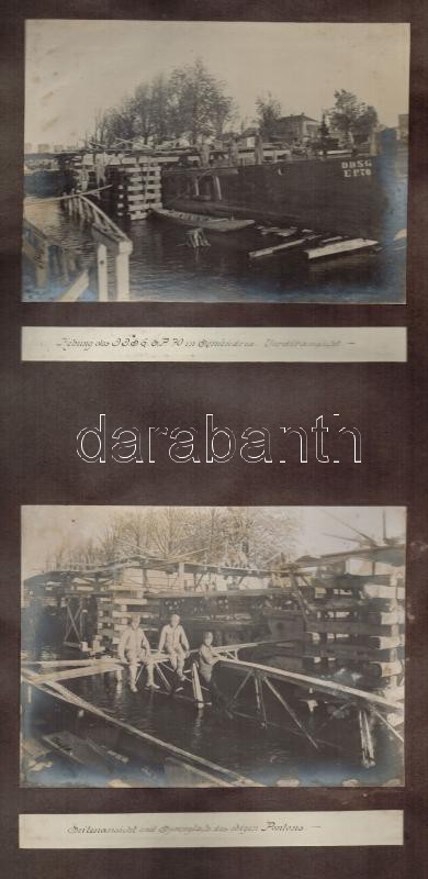 1914 A DDSG EP70 hajója Szendrőnél, más vizi objektumokkal, A szerbek az I. világháború kitörésekor süllyesztették el a hajót. 4 db érdekes feliratozott fotó (16x12 cm) kartonlapon. / DDSG steamer sunk by the Serbians at the outbreak of World War I. at Semendria 4 photos