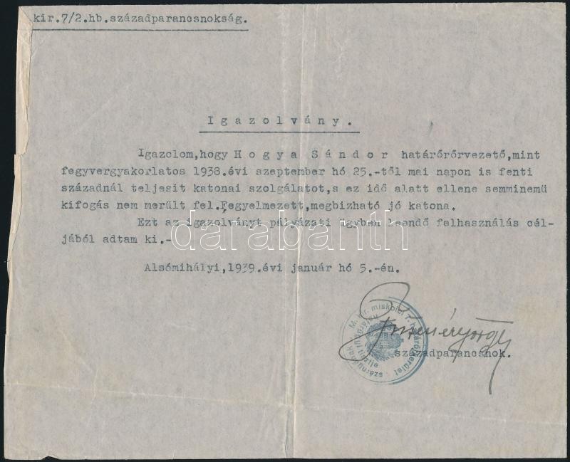Leírás: 1939 Alsómihályi, M. kir. 7/2. hb. századparancsnokság által kiállított igazolvány katonai szolgálatról