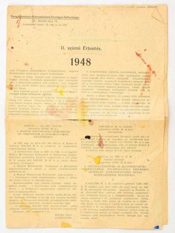1948 Nyugállományú Katonatisztek Országos Szövetségének 11. számú értesítése, 1848-as évfordulóra vonatkozó információkkal, Várady Albert ny. ezredes, a m. kir. varasdi 10. honvéd huszárezred egykori tisztje részére, a címlapon ceruzával "Fontos" bejegyzéssel, kissé foltos.