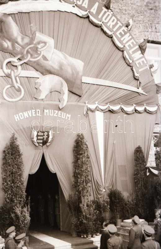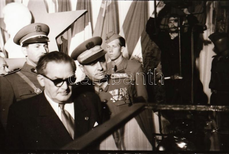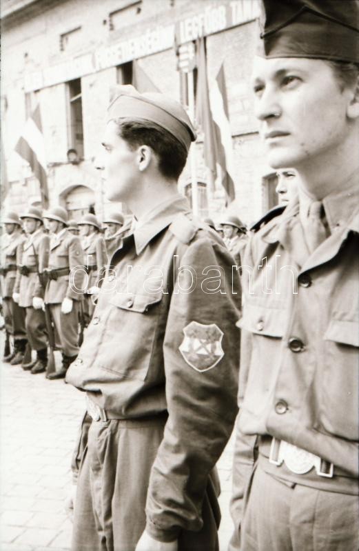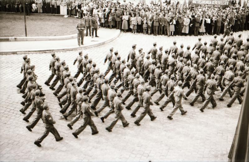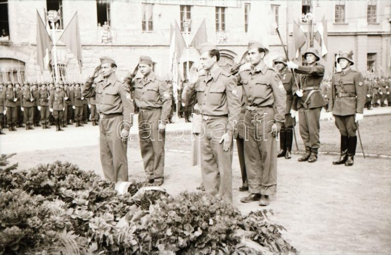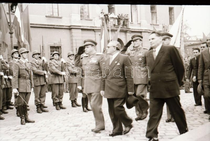 Leírás: cca 1949 Katonai ünnepség a budai várban, visszafoglalásának jubileuma alkalmából, 31 db szabadon felhasználható vintage negatív, 24x36 mm