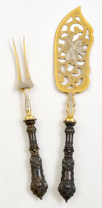 Leírás: Ezüst(Ag) nyelű tortalapát és húsvilla, 2 db, jelzett, h: 26 és 31 cm