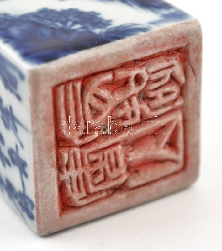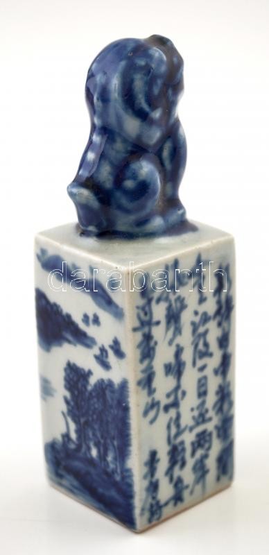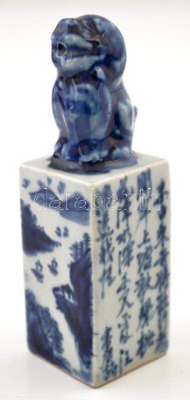 Leírás: Kínai pecsétnyomó, kékfestett mázas porcelán, Fő kutya figurával / Chinese porcelain seal maker with Pho dog, 10,5 cm