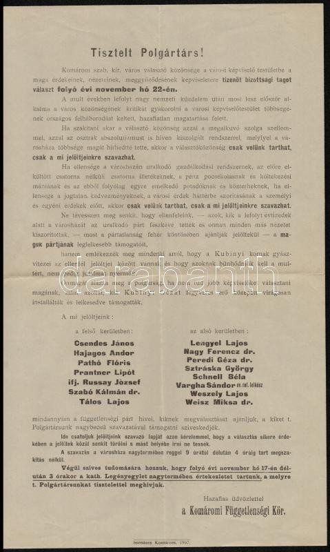 Leírás: 1907 Komárom, 2 db korteslevél a komáromi (Felvidék) helyhatósági választásokkal kapcsolatban, szép állapotban