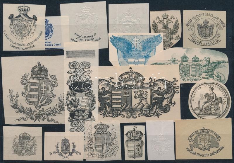 Leírás: A magyar címer, variációk egy témára, 30 db különféle ábrázolás, nyomat, papír, különböző méretben