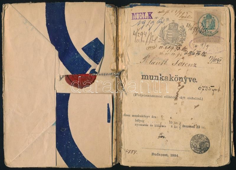 1892 Bognár számára kiállított munkakönyv megviselt állapotban https://www.darabanth.com/hu/318-Gyorsarveres/318.0/Festmeny-mutargy-papirregiseg-egyeb/Okmanyok~16/1892-Bognar-szamara-kiallitott-munkakonyv-megviselt-allapotban~II1756182