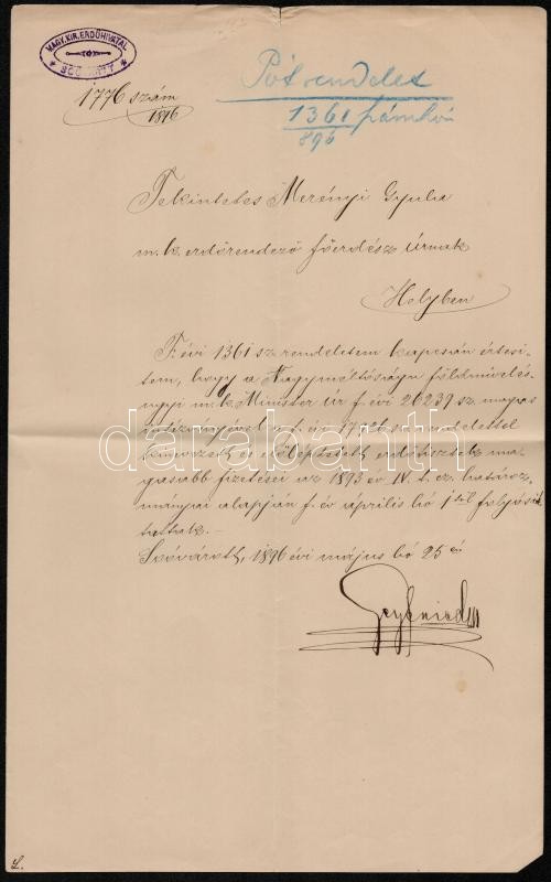Leírás: 1896 Sóvár (Tótsóvár, ma Solivar, Szlovákia), a sóvári magyar királyi erdőhivatal fizetési értesítése Merényi Gyula (?-?) főerdész részére