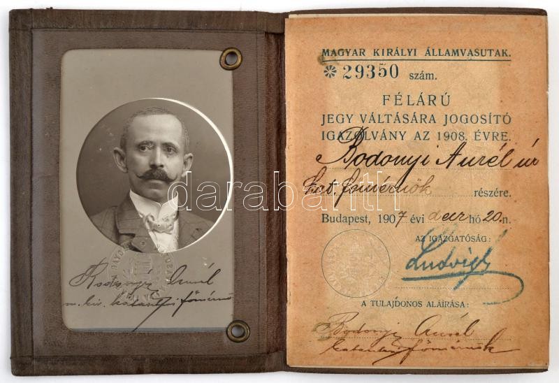 1907-1912 MÁV felárú jegy váltására jogosító fényképes igazolvány, főm... https://www.darabanth.com/hu/318-Gyorsarveres/318.0/Festmeny-mutargy-papirregiseg-egyeb/Okmanyok~16/1907-1912-MAV-felaru-jegy-valtasara-jogosito-fenykepes-igazolvany-fomernok-reszere-~II1699791