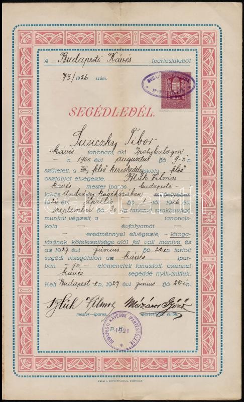 Leírás: 1927 Bp., A Budapesti Kávés Ipartestület által kávés tanonc számára kiállított segédlevél okmánybélyeggel