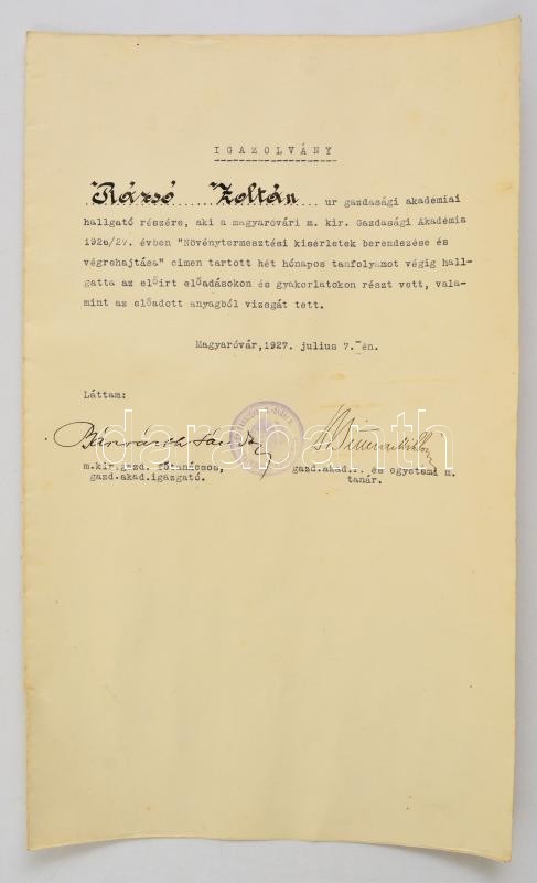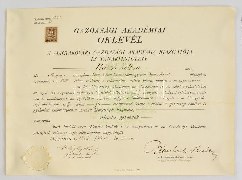 1928 A Magyaróvári Gazdasági Akadémia oklevele https://www.darabanth.com/hu/318-Gyorsarveres/318.0/Festmeny-mutargy-papirregiseg-egyeb/Okmanyok~16/1928-A-Magyarovari-Gazdasagi-Akademia-oklevele~II1748790