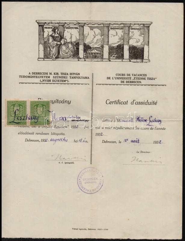 1932 Debrecen, A Debreceni M. Kir. Tisza István Tudományegyetem Szünidei Tanfolyama által kiállított kétnyelvű bizonyítvány, okmánybélyegekkel, aláírással
