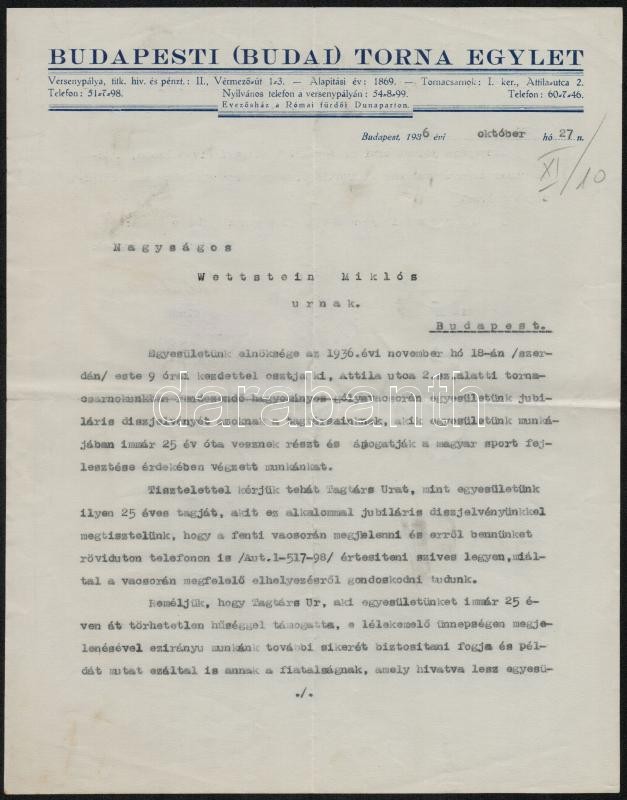 1936 a Budapesti Torna Egylet díszjelvény adományozó levele Wettstein Miklós (?-?) a Fanto Egyesült Magyar Ásványolajgyárak Rt. vezérigazgatója részére