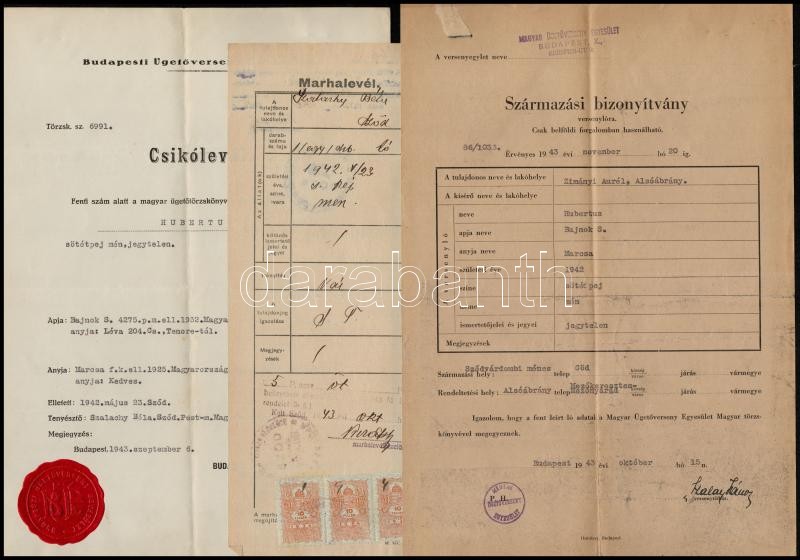 1939-1943 "Amica" és "Hubertus" nevű versenylovak ... https://www.darabanth.com/hu/318-Gyorsarveres/318.0/Festmeny-mutargy-papirregiseg-egyeb/Okmanyok~16/1939-1943-Amica-es-Hubertus-nevu-versenylovak-szarmazasi-igazolvanya-csikolevele-stb-6~II1754891