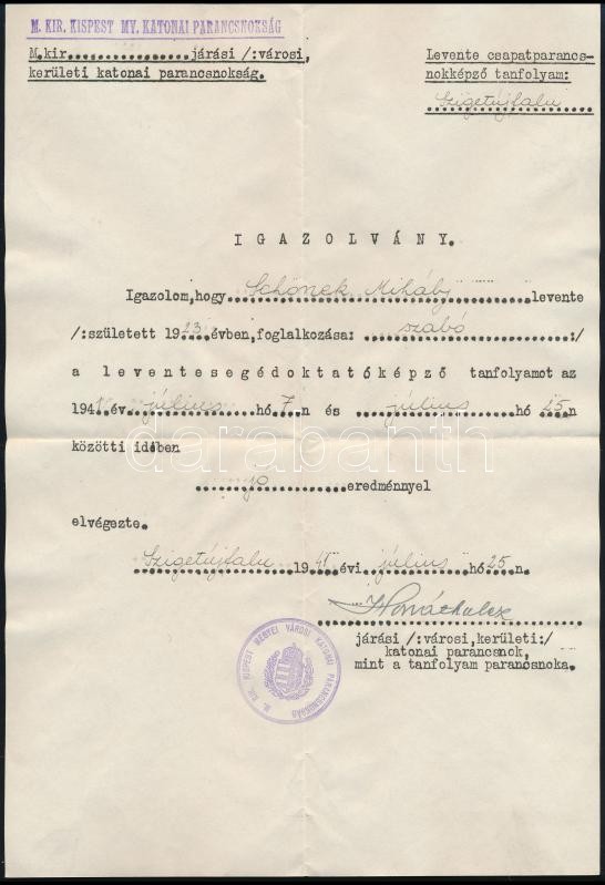 Leírás: 1941 Szigetújfalu, a kispesti katonai parancsnokság igazolása szabó részére leventesegéd tanfolyam elvégzéséről
