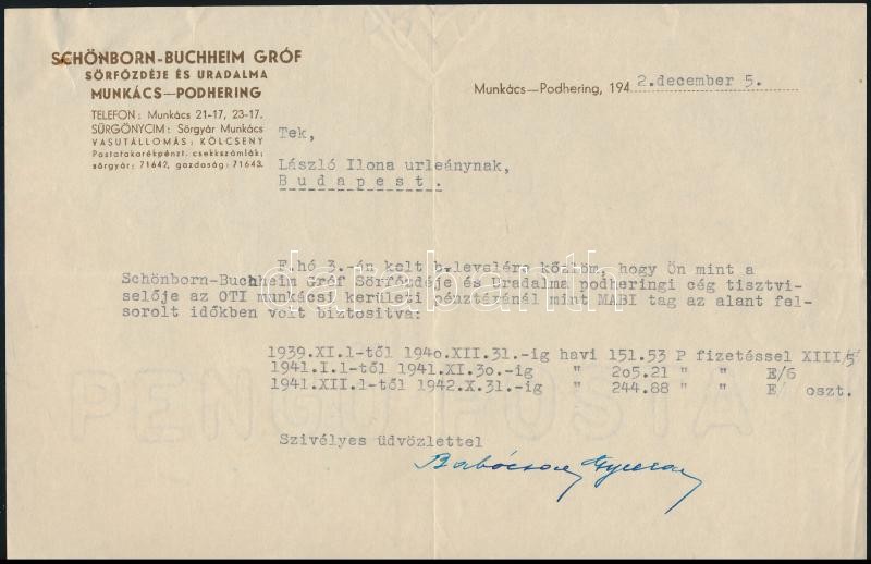 Leírás: 1942 a Schönbrunn-Buchheim Gróf Sörfőzde és Uradalma gépelt igazolása, fejléces papíron