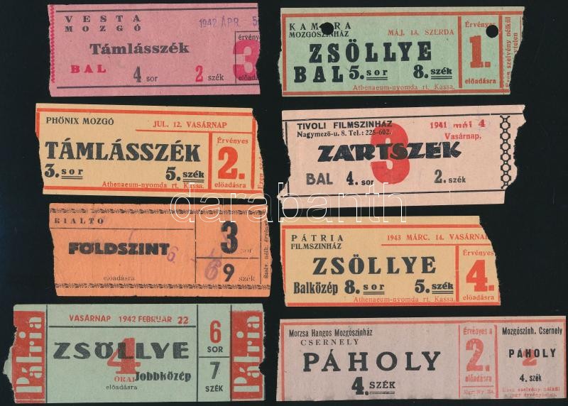 Leírás: cca 1941-1943 Budapesti mozijegyek (Vesta Mozgó, Morzsa, Rialto, Pátria, stb.), 8 db