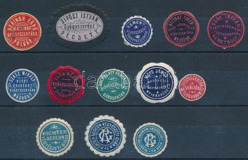 Leírás: Gyógyszertárak 10 db vidéki gyógyszertári pecsétbélyeg + 3 db Richter Gedeon