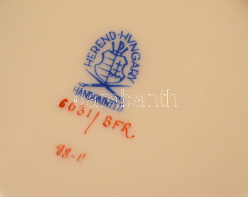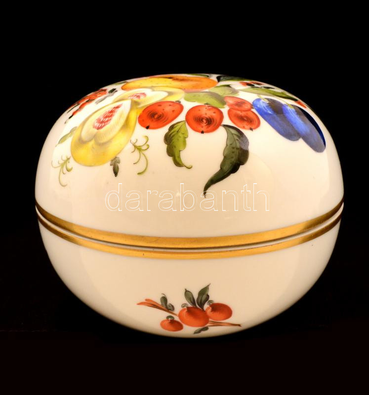 Leírás: Herendi virág- és gyümölcsmintás nagy bonbonier, kézzel festett, jelzett, kopásnyomokkal, d: 11,5 cm