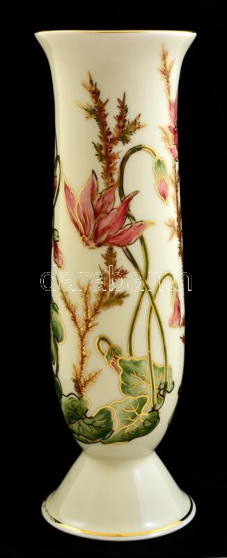 Leírás: Zsolnay ciklámen mintás váza, kézzel festett, jelzett, kopott aranyozással, m: 26,5 cm