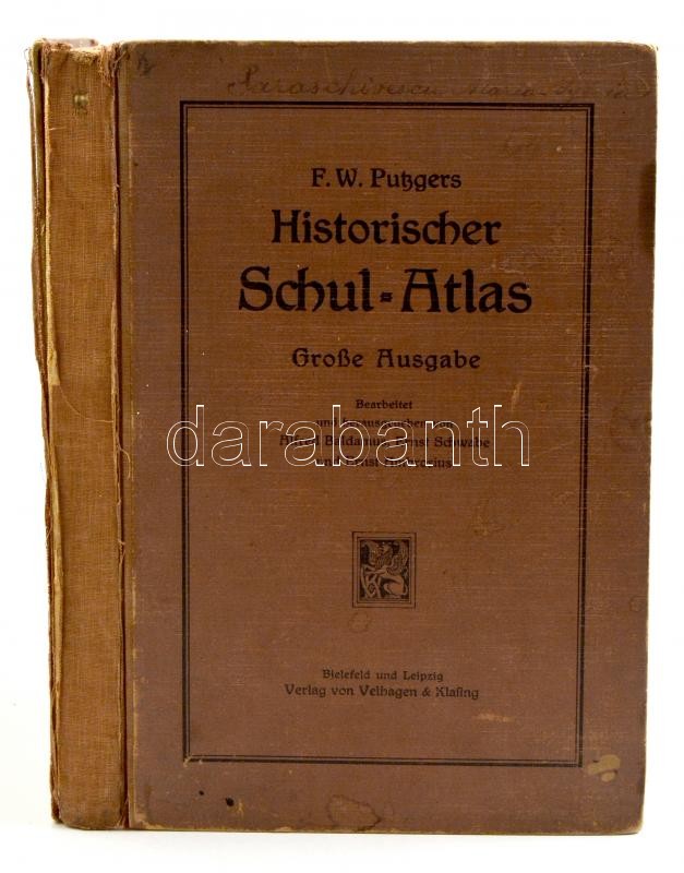 F. W. Putzgers: Historischer Schul-Atlas. Bielefeld-Leipzig, 1928, Verlhagen&Klasing, 15+168 p. Német nyelven. Kiadói kopott borítóval, megviselt állapotban, kopott borítóval, sérült gerinccel, kijáró lapokkal, két oldalon felületi sérüléssel, egy amatőr módon javított lappal (5,6;7,8.) /Linen-binding, in poor condition, with worn cover, damaged spine, some pages are coming out, two damaged pages, one page repaired. (5,6;7,8.)