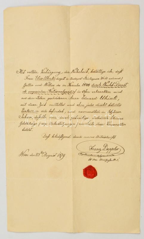 1879 Szegénységi bizonyítvány Elise Uhink részére, akinek férje 1848-ban Budán, nemzetőrként éjjeli őrjárat közben meghalt, Doppler Ferenc (1821-1883) fuvolaművész, zeneszerző, karmester, bécsi udvari operaház balettkarmesterének és első fuvolásának aláírásával, német nyelven, viaszpecséttel.