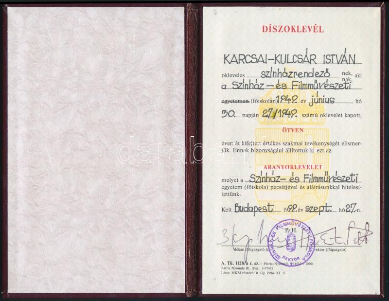 Leírás: 1999 Színházi aranyoklevél Karcsai Kulcsár István (1925-2009) rendező részére, Huszti Péter (1944- ) színész, főigazgató aláírásával