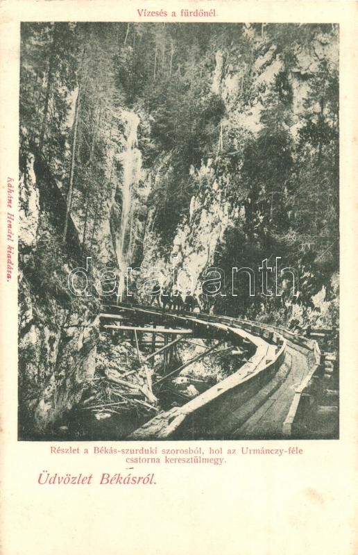 Békás, Cheile Bicazului; Békás-szurduki szoros az Urmánczy-féle csatornával, vízesés a fürdőnél. Káháne Hendel kiadása / channel in the gorge, waterfall