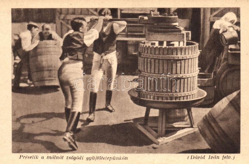 Leírás: Csíkzsögöd, Zsögöd, Jigodin; Préselik a málnát zsögödi gyűjtőtelepen. Erdélyrészi Hangya Szövetkezet kiadása, Dávid Iván felvétele / raspberry pressing at the fruit processing plant in Jigodin - képeslapfüzetből / from postcard booklet