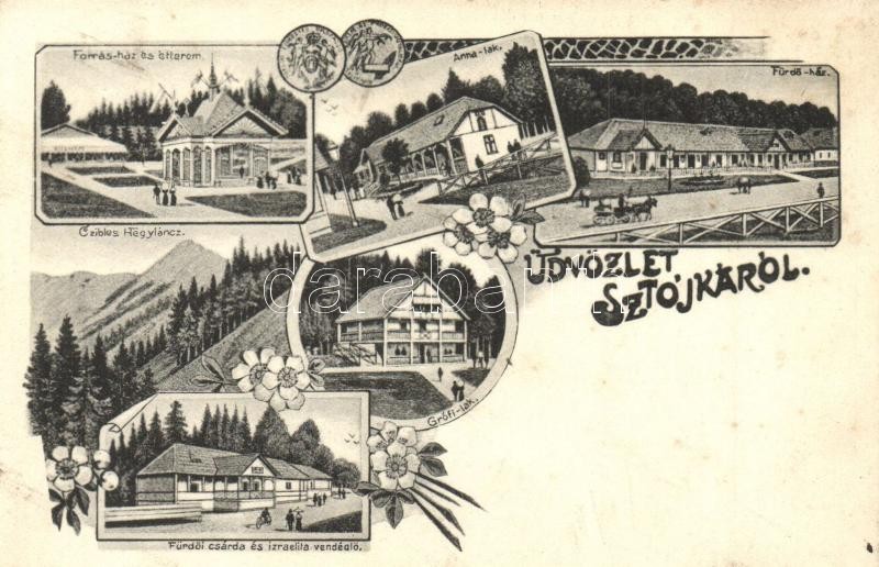 Sztojkafalva, Sztójka, Stoiceni; Forrás ház és étterem, Cibles hegység, Anna lak, Fürdőház, Grófi lak, Fürdői csárda és izraelita (zsidó) vendéglő, étterem / thermal spring, spa hall, restaurant, Muntii Tibles, villas, Jewish restaurant. floral Art Nouveau (fl)