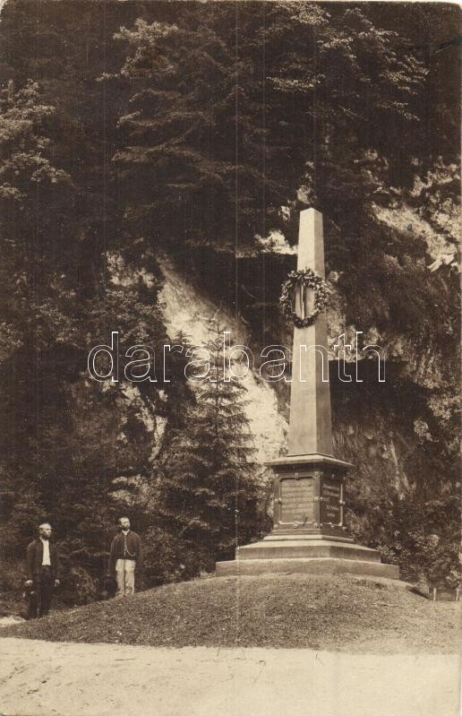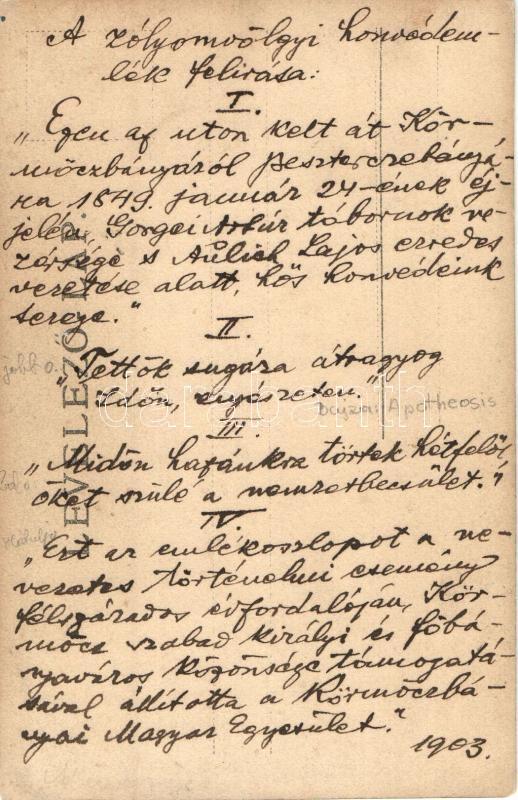 1903 Körmöcbánya, Kremnitz, Kremnica; Zólyomvölgyi 1849-es honvéd szobor avatásakor (a Turult később helyezték rá), emlékmű. A honvédemlék felirata a lap hátoldalán olvasható / 1849 Heroes' monument after the inauguration, statue, memorial. photo