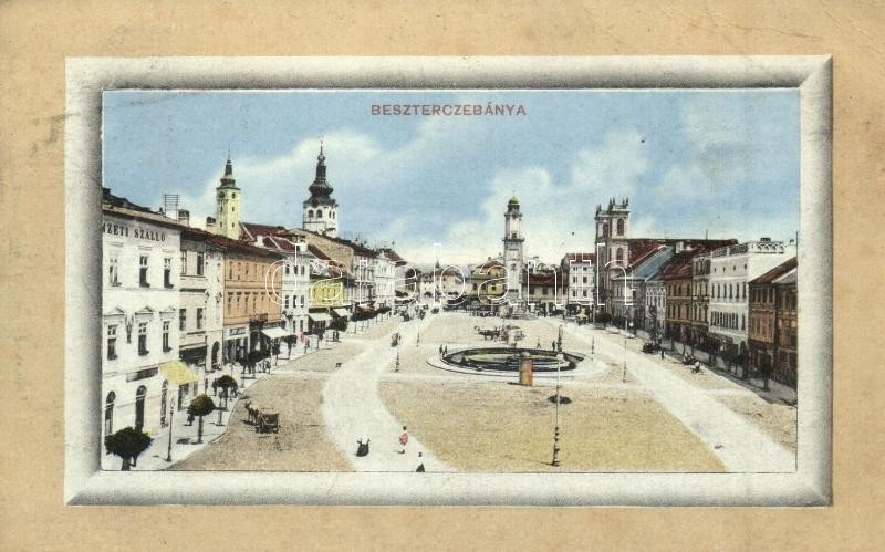 Leírás: Besztercebánya, Banska Bystrica; Fő tér, Nemzeti szálloda, Löwy Jakab üzlete, templomok / main square, hotel, shops, churches (EB)