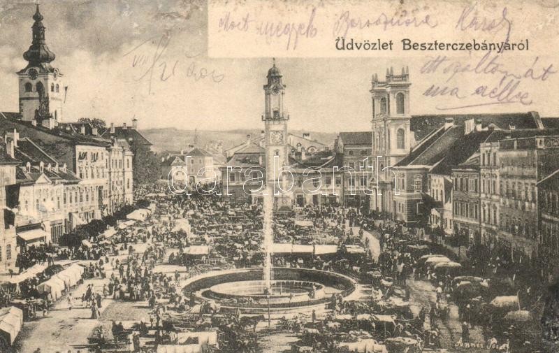 Leírás: Besztercebánya, Banska Bystrica; látkép a piaccal / market with vendors (r)