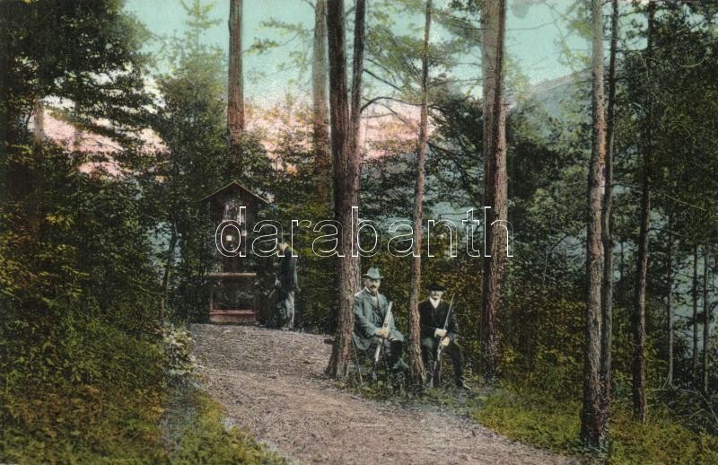 Leírás: Trencsénteplic, Trencianske Teplice; Erdei kereszt, vadászok / forest monument with hunters