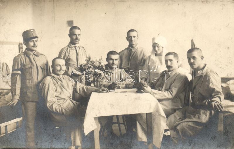 Első világháborús osztrák-magyar sérült katonák kártyázás közben a tábori kórházban / WWI K.u.k. military, injured soldiers playing card game in the field hospital. Lázár A. photo