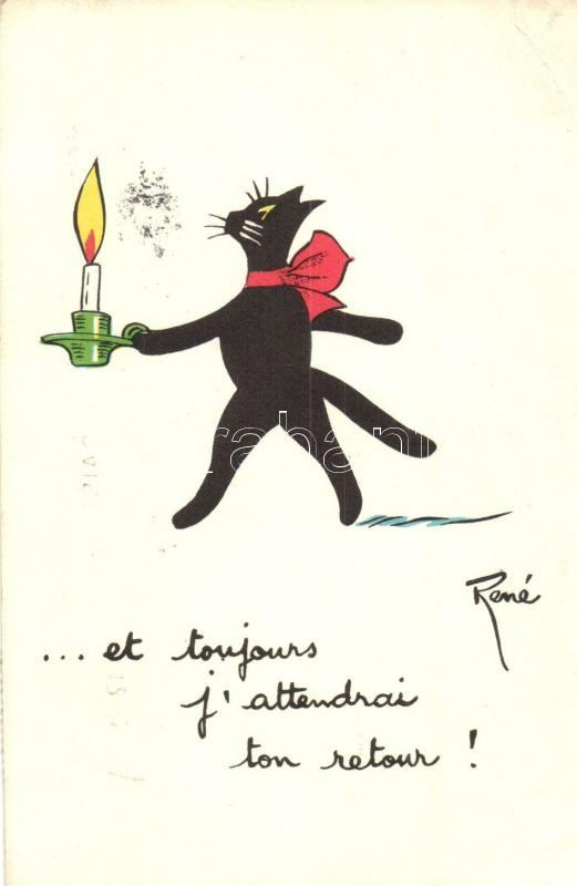Leírás: Cat walks with candle. French art postcard. s: René (EK)