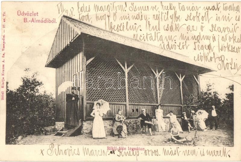 Balatonalmádi, Rikli-féle légsátor. Kiadja Krausz A. és fia 27. sz. https://www.darabanth.com/hu/318-Gyorsarveres/318.0/Kepeslapok/Magyarorszag~2500013/Balatonalmadi-Rikli-fele-legsator-Kiadja-Krausz-A-es-fia-27-sz~II1752640