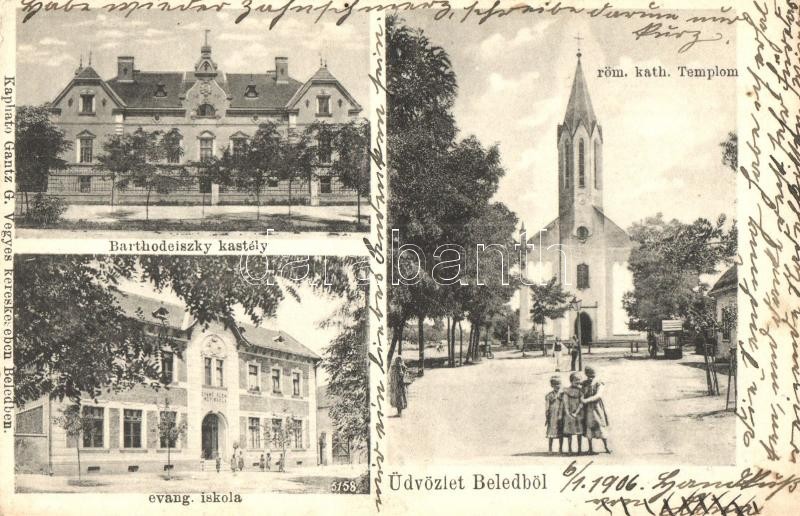 Leírás: Beled, Barthodeiszky kastély, Római katolikus templom, Evangélikus iskola. Gantz G. kiadása (EK)